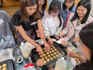 金原会長のご挨拶から始まり、手づくりのちらし寿司とたこ焼きづくりを体験。 技能実習生たちの「日本に来たら食べたい料理ランキング」で常に上位の“たこ焼き”を、皆さんで笑顔いっぱいに作りました。